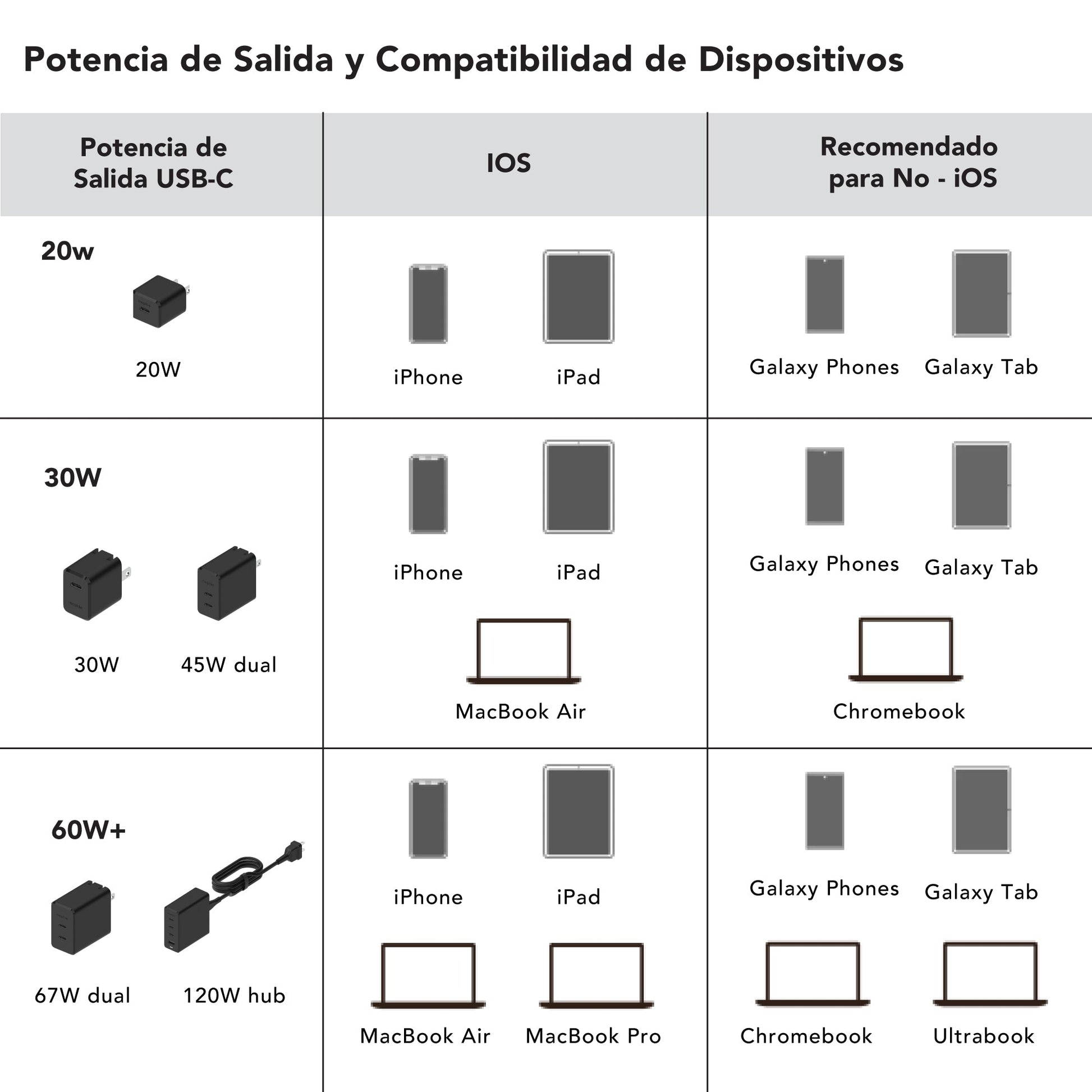 iPhone, iPad, dispositivos Apple, smartphones y tabletas con entrada USB-C compatibles con carga rápida. La carga eficiente de carga rápida es para modelos iPhone 8 en adelante. Podrás cargar modelos anteriores de iPhone pero sin la modalidad de carga rápida que no está disponible en esos dispositivos.