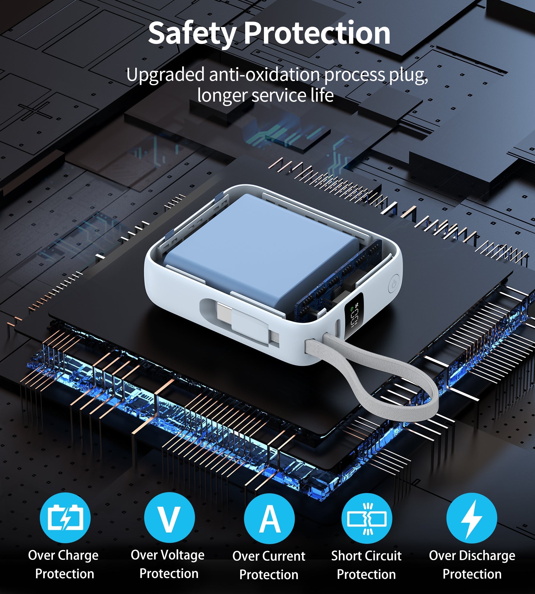 Su cable USB-C integrado elimina la necesidad de llevar accesorios adicionales, lo que lo convierte en un aliado perfecto para viajes, universidad, oficina o creación de contenido en movimiento. Además, cuenta con doble salida (USB-C + Cable USB-C Integrado) para cargar dos dispositivos de manera simultánea, optimizando tu tiempo y practicidad.