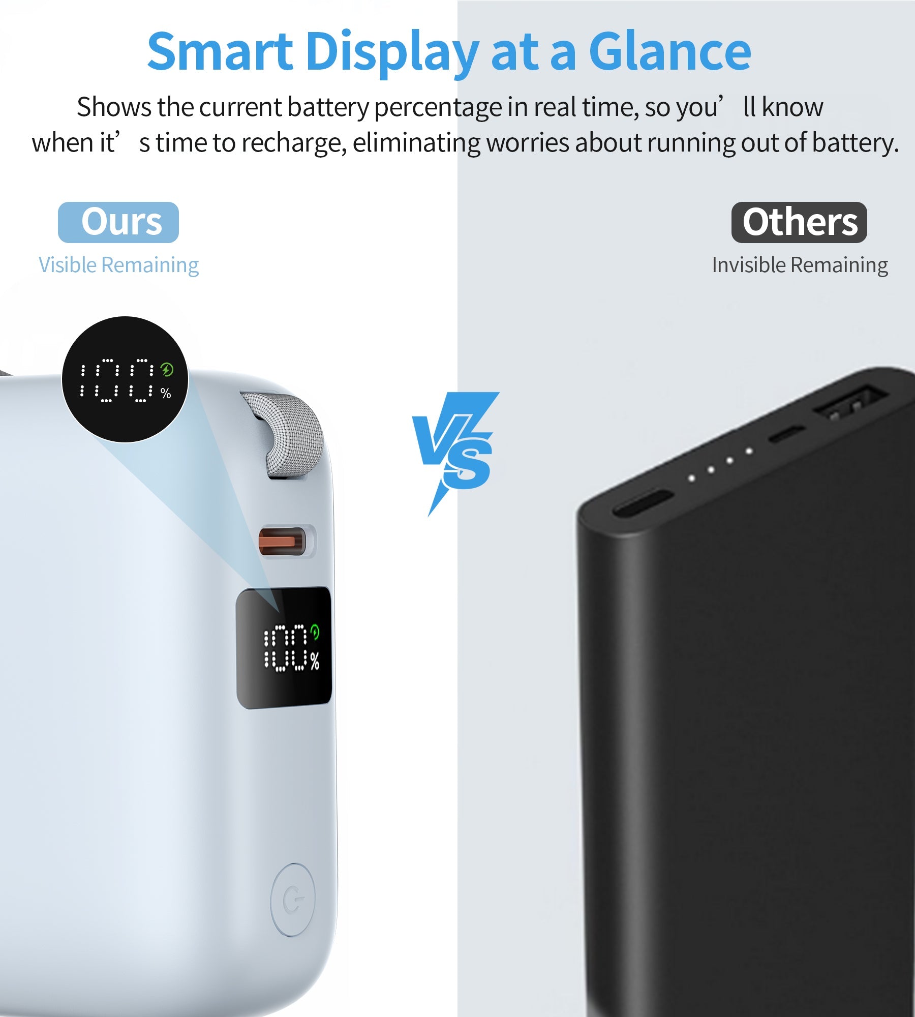 El diseño del B832 es compacto, ligero y minimalista, ideal para guardarlo en un bolsillo o mochila sin ocupar espacio. Su pantalla LED inteligente permite controlar fácilmente la energía restante con total precisión.